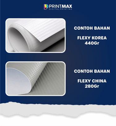 Untuk kebutuhan jangka pendek, seperti promo, event, atau banner sementara, Flexy China 280gr jadi pilihan paling hemat. Hasil cetak tetap tajam, harga lebih terjangkau, dan cocok untuk pemakaian beberapa hari hingga mingguan.